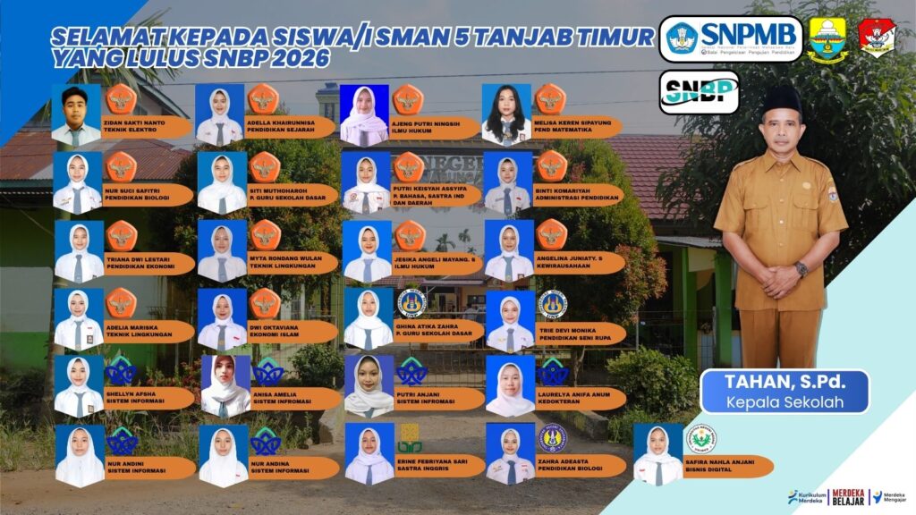 Berikut nama-nama siswa/I SMAN 5 Tanjab Timur yang lulus SNPMB (Seleksi Nasional Penerimaan Mahasiswa Baru) 2026 beserta jurusan: